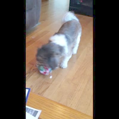 A small dog unwraps a Christmas present, which is a ball. The ball rolls away, but the dog doesn't notice and he looks around for his gift.