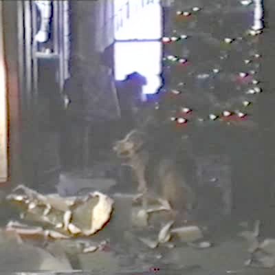 Dog opens his Christmas present, then goes under the tree and grabs another to open.