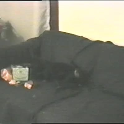 Dad holds baby on lap, opens Christmas gifts. Baby coughs, spits out pacifier, & projectile vomits / pukes. Short tail. Then fade in, dad's cleaning up. Xmas. Camera on sepia. Throw up. Holidays, presents.