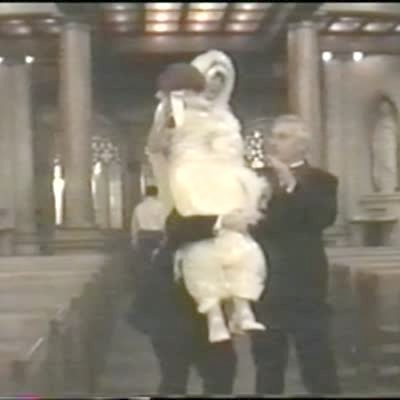 During wedding reception, a monsoon hits. Bride and maids wrap up in plastic. Funny image. Groom carries bride in plastic and everyone unwraps her when they get to the building. *long for edit