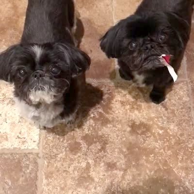 A woman asks her dogs which one of them had unwrapped the Christmas gifts in the house. The two dogs look at her as one dog has gift wrap in its mouth.