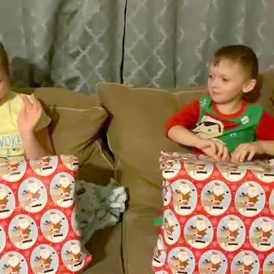 A woman asks a young boy and a young girl if they are sure that they each want to open one Christmas present early. They take gift wrap off of two large boxes, and they yell and complain when they see that they unwrapped plastic storage containers full of small wrapped gifts. Christmas