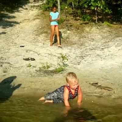 A man jumps into a lake and then a tot boy jumps but he's not close to the water, so he falls on the ground. He gets up and does it again but he still struggles to get in the water.