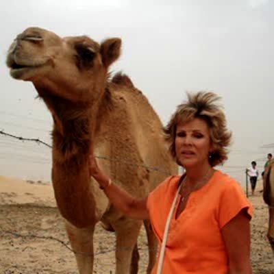 A woman pets a camel outdoors and backs up wide eyed when the camel gets too close. Short tails.