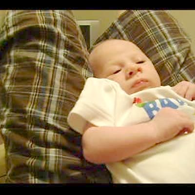 Baby boy in a onesie lays in man's lap and farts while camera is in close up.
