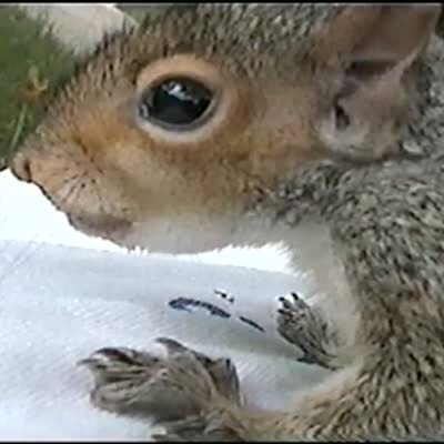 Squirrel takes a peanut out of a bag when he's close to man and woman feeding him. Eats fast and furiously and chomps. Close-up. Funny visual.