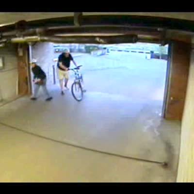 Garage door opens, man on bike rides in. As door begins to close a second person rides up and hits the closing door. No audio Security camera.