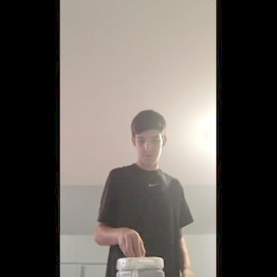 A teen boy flips a Gatorade bottle and it lands upside down. Then he flips a water bottle and it lands right side up on top of the Gatorade bottle.