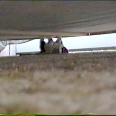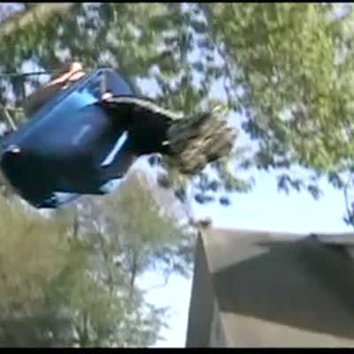 Dad pushes tot boy really high on tree swing, the rope breaks and boy goes upside down. Mom behind camera screams, man has caught son and he's ok.