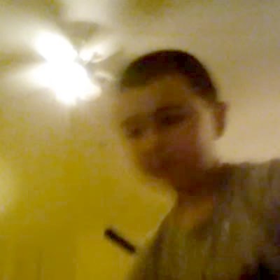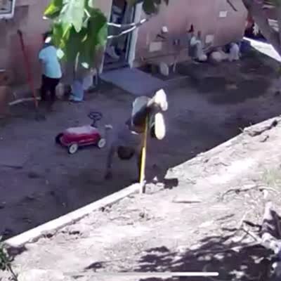 A young boy pushes a crowbar into the ground in a yard and jumps on top of it.Then he gets stuck upside down and yells for help. Security footage.