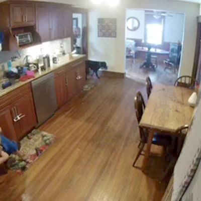 Security camera footage of a young boy who jumps down from the kitchen counter, but his belt loop gets caught on a cabinet, so he gets stuck on it and hangs upside down until his mom comes over to help him get down.
