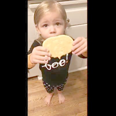 A man asks his daughter to show her cookie to the camera then asks to see the other side so she flips it upside down instead of turning it around