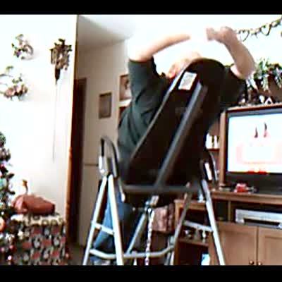 Man lays upside down in the living room in an inversion chair. He slides down to the floor.