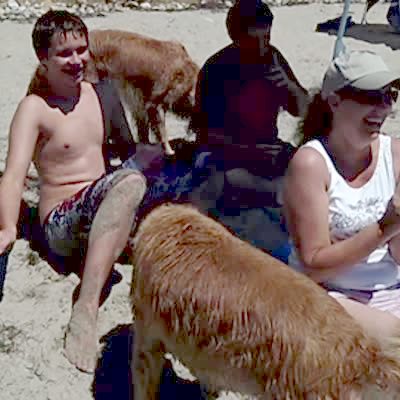 Golden retriever dog pees on teen boy sitting with family on beach, mom cracks up.