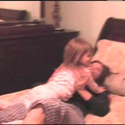 "Bladder Blunder" Mom on bed lifts young girl up with her feet. Laughing girl suddenly pees on her mom. Girl walks to bathroom with a wet butt. Gross.