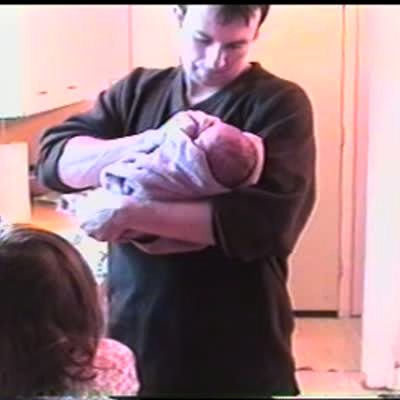 Baby pees onto dishes in kitchen sink after its first bath. Dad holds baby, Mom says "he's going to pee in your face."