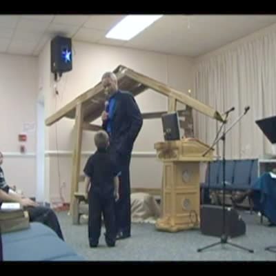 A preacher man talks to several people at the front of a church. A young boy walks up to him at the front of the church and asks where the bathroom is. A woman leads the boy away as a crowd of people laugh.