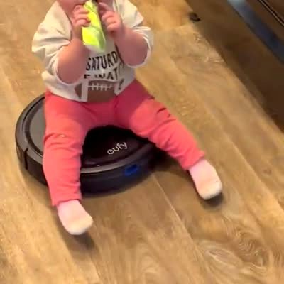 A young girl sits and rides on Roomba vacuum. The vacuum goes under the kitchen chair and the girl falls off.