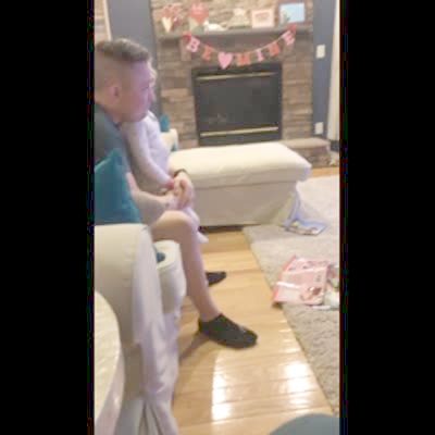 A man watches football as he holds a tot girl but when his team wins he shoves the girl aside and jumps towards the TV. He then bends downs an slams the floor with his hand which causes some of the Valentines decorations to fall down.