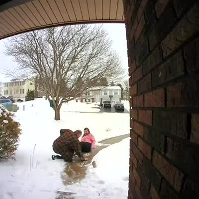 On Valentine's Day morning, a woman walks out the front door of a house and slips on winter snow and ice on the sidewalk. Her husband walks after her and he slips and falls too. His coffee tumbler bounces off the ground and hits him on the head. Ring home security camera
