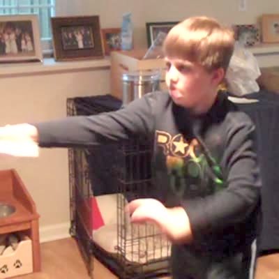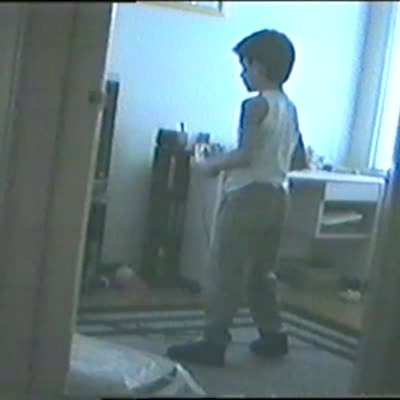 A young boy plays a virtual reality video game when he runs forward and hits the television, breaking it with his controller. Security footage.