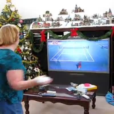 Woman plays Wii tennis and accidentally hits man in the back of the head with the remote.