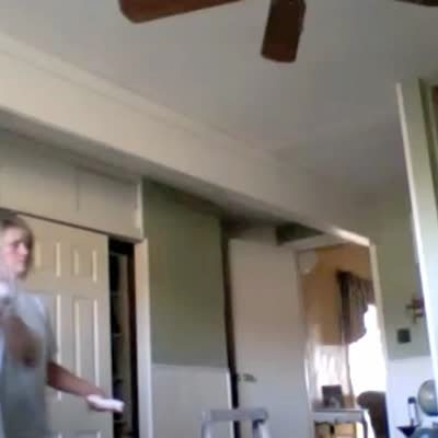 2 teen girls play Nintendo Wii Tennis video game. Girl accidentally hits the light above her head with controller. She breaks a bulb. Dad comes in & takes bulb away.