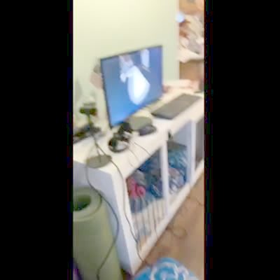 A teen girl plays a virtual reality video game in the living room. She runs forward and crashes into the table that the monitor is set on and knocks everything down.