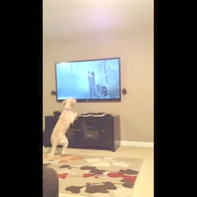 A dog watches television while a man plays a video game. A wolf in the game scares the dog and it knocks something off the entertainment stand.