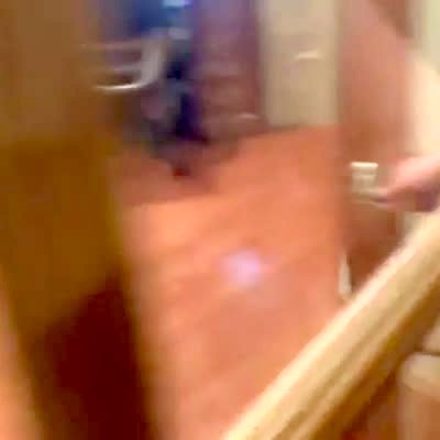 A young boy has virtual reality goggles on in the house. He punches the air. Then he accidentally punches a bottle on a bar cart. It falls and breaks spilling dark liquid all over the floor. Security footage.