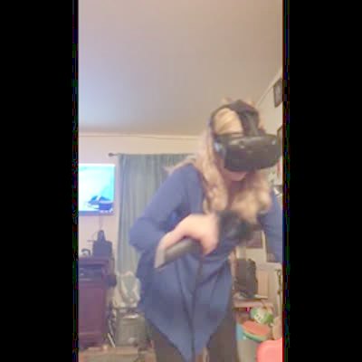 A woman plays a VR game and waves a game controller in front of her, then she punches her son as he walks by her in a living room.