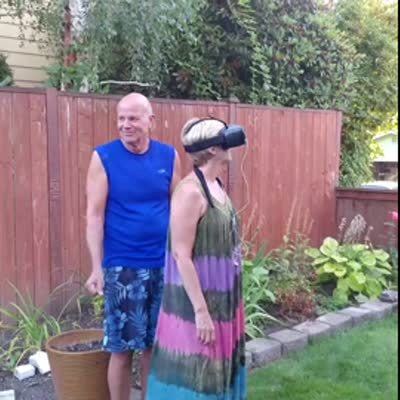 A woman with a VR headset on outside bumps back into her husband and they both tumble backwards into some plants and a fence.
