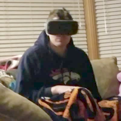 A teen boy wears a virtual reality head set. He gets scared and falls off his chair.