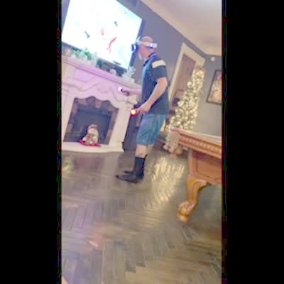 A young boy walks as he uses a virtual reality headset and falls into a Christmas tree.