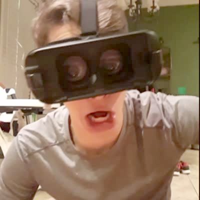 A woman puts on a virtual reality headset, and then she sees something and she screams and runs into a wall.