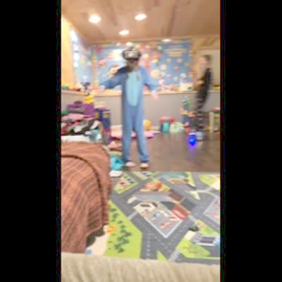A young boy wears a virtual reality headset, trips and falls into an entertainment center.
