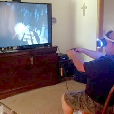 A man in the living room wears a virtual reality headset and punches at the air. The man accidentally runs into the television and dents it.