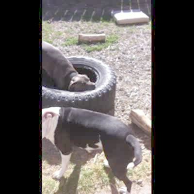 A Staffordshire Terrier dog outdoors grabs a large truck tire with its mouth and walks it across the yard. A black and white Staffordshire Terrier dog is visible.