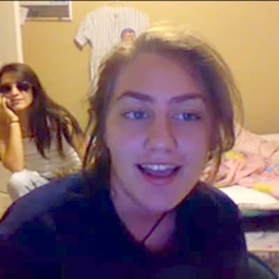 Teen girls film themselves in bedroom. One girl leans over to be more visible, almost falls over but catches herself. A mirror falls off the wall and hits her on the side of the head. Webcam.