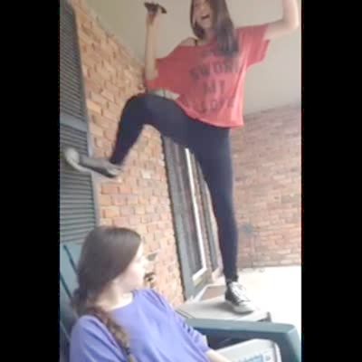 A woman attempts to mimic the famous dance lift scene from Dirty Dancing, but the man who catches her lets her topple over him as he drops her to the ground. No release for the woman who wanders into the frame at the end (face not visible). Music rights not cleared.