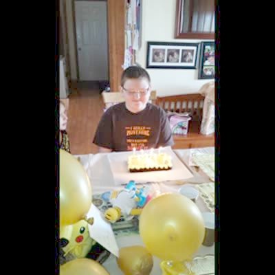 A boy indoors blows the candles on his birthday cake, causing glitter on the cake to fly into the air. A tot girl and woman are visible.