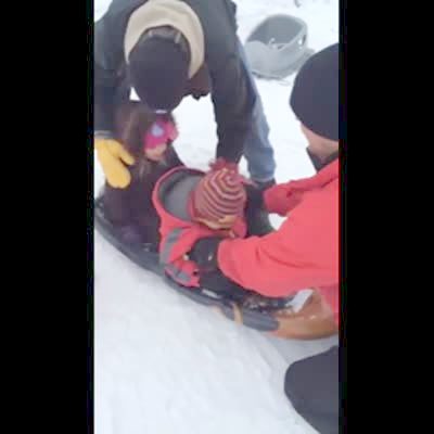 A tot girl and tot boy sled outdoors while a man sleds next to them and falls in the snow. The tots almost crash into two boys and into a fence, but the man intercepts them. Another man is visible, and a man is audible.