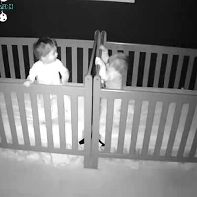 Two twin tot boys stand in their cribs in a bedroom and jump up and down. When they hear a voice on the baby monitor at the same time they dive back into their cribs and pretend to be asleep. Baby monitor footage.
