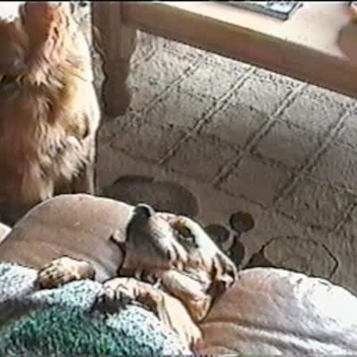 "Leave Your Message At The Bark" Man leaves dog a message on the answering machine. The dog plays it three times. He howls when he hears his owner's voice on message