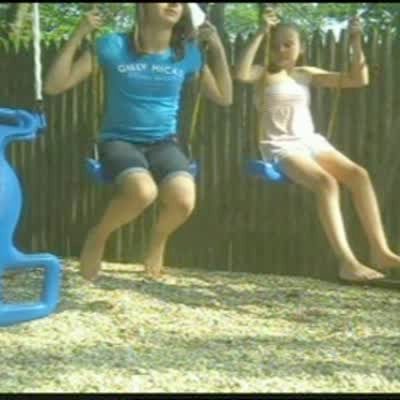 Two girls swing on backyard swingset, the whole thing falls apart and comes crashing down around them. With recovery. OC voice says "well I guess it's time to get rid of that"
