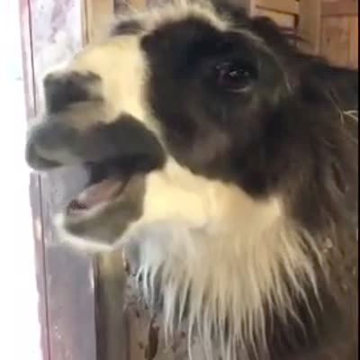 A woman sings in an operatic voice when a llama shakes its lips in a barn.