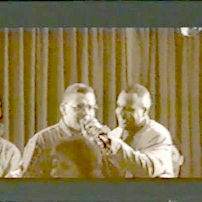 2 men sing on stage. One man sings in a silly high voice*black and white