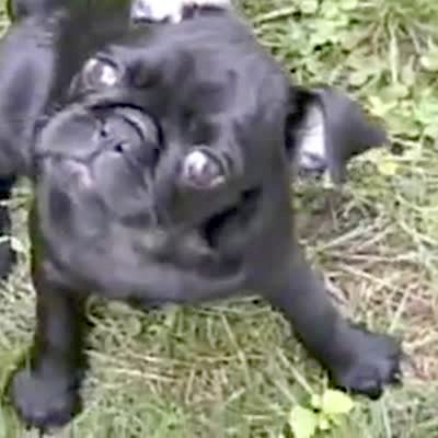 Black pug puppy tilts its head from left to right every time person holding the camera makes a sound with their voice. Dog.