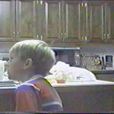 Boy sings in the shower in a high pitched voice behind sliding door. He screams & closes the door when he sees the camera.