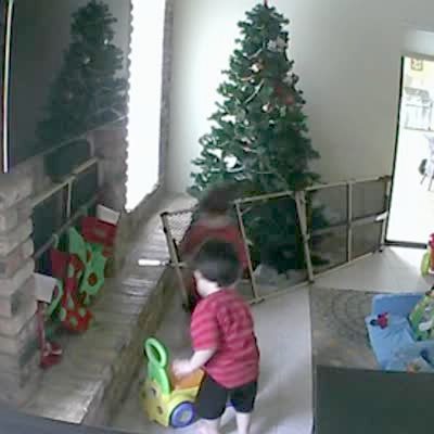Security footage shows twin boy tots playing with Christmas tree ornaments as a woman's voice comes on a loud speaker and says "Santa's watching" and will not give them presents.